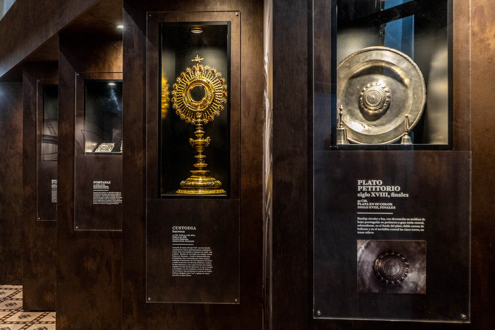 Para ello, se ha apostado por la fabricación de unos módulos de hierro oxidado que van formando un zig-zag y que se integran perfectamente con el espacio en el que están ubicados. En cada parte frontal, encontramos las piezas más importantes, con su explicación, mientras que en la parte posterior se ha apostado por una fotografía panorámica de la misma Iglesia troceada. Siguiendo el recorrido de este zig zag, llegamos al final de la capilla, donde tenemos más piezas de orfebrería ubicadas en dos vitrinas.